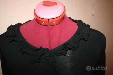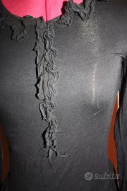 Vestito con collo tondo bordato da voulant doppio, che prosegue sul davanti del vestito. Maniche lunghe, tessuto elasticizzato, due balze In viscosa al fondo.
