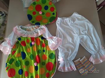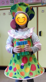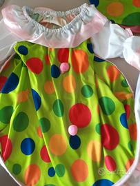 Vendo vestito da Carnevale Monella Clown per bambina taglia 5-7 anni, completo di vestito con cerchio, pantaloni/mutandoni, cappello e calzini colorati in omaggio.