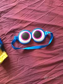 Include tuta blu con cappuccio, leggings gialli e occhiali da pesce.