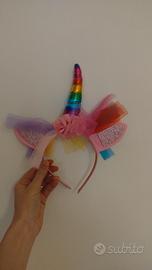 vestito di carnevale da unicorno composto da gomma arcobaleno e cerchietto. taglia non specificata. l' ho usato per mia figlia di un anno e mezzo ma la gonna è molto elastica e può essere indossata anche da bambine più grandi. assieme al vestito vendo un ulteriore cerchietto e due set di unghie e ciglia finte (mai usate nella confezione originale).