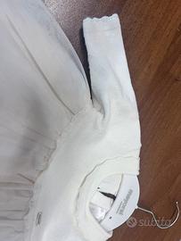 Color panna con luccichini sulla gonna (si intravedono nelle foto, ma dal vivo molto di più). Colletto e polsini con merletti. Gonna con interno in tulle.
