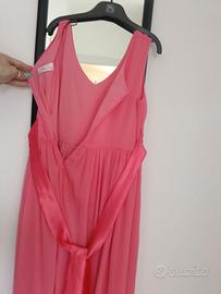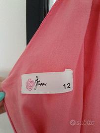 Vestito colore salmone intenso con fiore davanti e cinturino simil raso che si allaccia dietro. Taglio stile impero. Mia figlia l'ha portato per la comunione e per un matrimonio finché è arrivata a un'altezza di 1.50 MT. Qualche filetto tirato nella gonna ma ben nascoste dalle pieghe del vestito