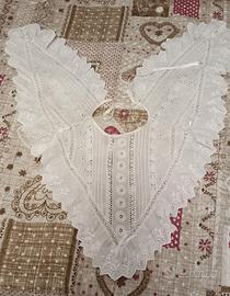 Vendo elegante vestito sartoriale (Perrecca Cagliari) in pizzo Sangallo composto da tre parti come da foto, usato due volte. Per la taglia riferirsi alle misure indicate in foto perché cucito su misura. Consegno a mano a Quartu e con possibilità di spedizione.