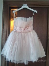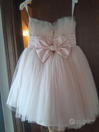 Vestito comunione,ma adatto anche per damigella, o cerimonia. È Rosa chiarissimo, molto elegante e fine.dietro è molto particolare,ha la chiusura con i bottoni a perline ed ha questo bel fiocco, porta anche l'altro fiocco per i capelli,pagato a parte ma lo regalo vicino al vestito. Indossato poche ore e portato in lavanderia. 3891607031