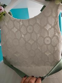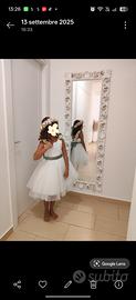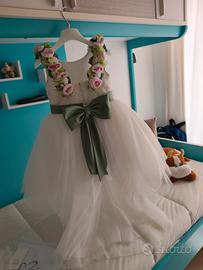 Abito comunione azienda "Colori Chiari anno 2025" ,colore bianco e verde salvia , indossato una sola volta , accessori abbinati " corona di fiori e manicotti usati pochissimo tempo" , fascia di fiori sulle spalle si possono usare sulla cinta perché fissati con spille.