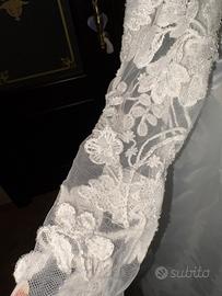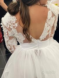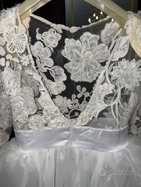 Vestito Comunione Sartoriale Fatto nella Sartoria Miss Unike Taglia 10/12 anni Corpetto manica lunga con tessuto di pizzo con dettagli del fiore in rilievo , il dietro con scollo a V Gonna ampia semi trasparente con coulotte
