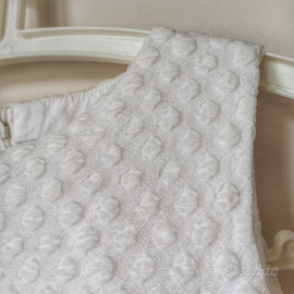 Colore panna, smanicato, cintura gioiello, corpetto in tulle, con chiusura zip sulla parte posteriore, girocollo e gonna ampia, grazie al sottogonna in tulle e mussolina di cotone.