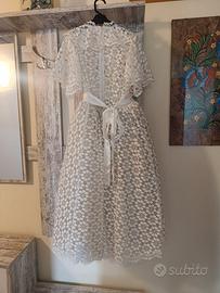 Vendo splendido vestito da damigella per bambina, realizzato interamente a mano con cura sartoriale. Un capo esclusivo e pezzo unico, perfetto per cerimonie, matrimoni o eventi speciali. Il vestito è caratterizzato da raffinati dettagli in pizzo floreale e da una linea elegante e romantica, con cintura decorativa in vita e gonna ampia.