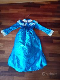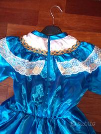 Causa cambio taglia vendo bellissimo vestito da principessa azzurro con cappello, realizzato per bambine di 7 - 9 anni. Sul davanti spicca la zona centrale bianca impreziosita dai ricami con oro e tulle, presenti anche sulla zona spalle e sui polsini; il look si completa con il cappellino reso unico dal gioiello applicato, gemello di quello posizionato come ciondolo sul davanti. Disponibile alla spedizione con spese a carico dell'acquirente.