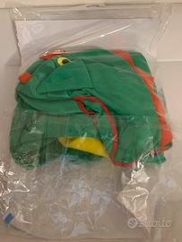 Vestito da drago per neonati, taglia 1-2 anni. - Tutina in pile con cappuccio. - Design a drago verde e giallo. - Prodotto in Italia.