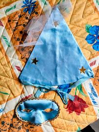 Vendo vestito di carnevale Fata Turchina per bambina, vintage, colore azzurro con profili in oro,cappello con stelle e tulle, mascherina.