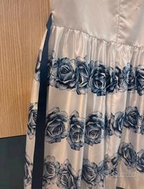 Mai indossato, nuovissimo, il vestitino si presenta bianco con delle roselline blu e dei brillantini dello stesso colore. Leggero, da cerimonia. Per bambine di 9/11 anni circa. Presenta, come da foto, un cinturino blu che si allaccia sul retro