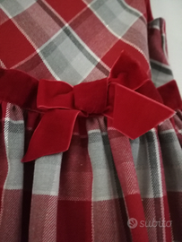 Vestito da bambina, rosso a quadri grigi, con cintura e fiocco rosso in vita, gonna con tulle, chiusura sulla schiena con cerniera invisibile. Taglia 5-6 anni