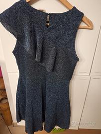 Vendo vestito elegante smanicato di colore blu notte, con volant nella parte superiore. Chiusura dietro con bottoncino. Tessuto molto morbido.