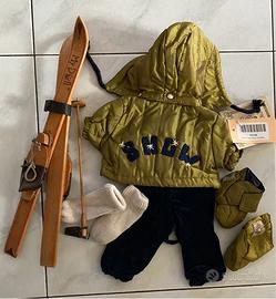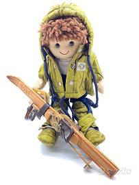 Abbigliamento da sciatore per bambola da 32 cm. MY DOLL, nuovo, con cartellino, e nella confezione originale. Il completo da sciatore è composto da giubbotto verde con cappuccio rimovibile, salopette blu in velluto, maglia bianca , calzettoni , scarponi, e sci in legno. Articoli da collezione e fuori produzione, adatto per bambini o da amanti delle bambole di stoffa.