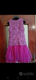Vestito bimba adatto a cerimonia. Foderato. Collo impreziosito da roselline. Parte alta in macramé viola, parte bassa in tulle fucsia . Etichetta interna staccata. Taglia ,anni 10