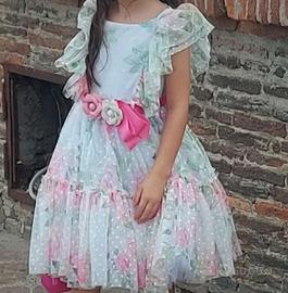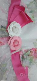Bellissimo vestito monnalisa elegante con effetto nuvola il leggero abito in tulle stampato con roselline e maniche accennate decorate con gallette e cintura fuxia in vita con rose applicate ottima vestibilità di taglia 8 anni