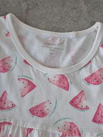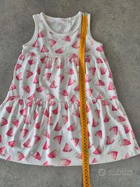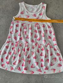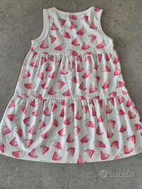 Vestito Name It senza maniche morbido 100% cotone con stampa fantasia anguria. Cuciture arricciate e gonna svasata. Usato poco come nuovo. Taglia 3-4 anni 104 cm Misure nelle ultime foto
