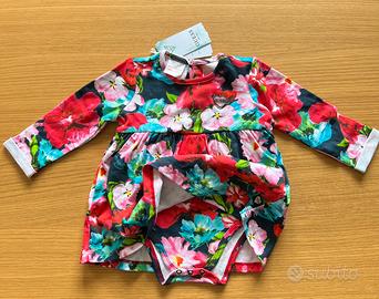 Girocollo, maniche lunghe, body incorporato, chiusura con bottoni sul retro.