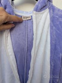 Morbido e divertente vestito da unicorno viola, perfetto per feste o serate a tema. Il cappuccio è decorato con corno giallo e dettagli del viso.