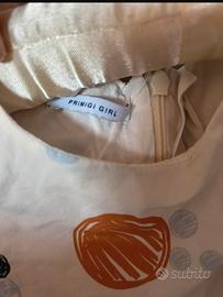 Abito per cerimonie o feste, sfondo bianco con fantasia geometrica nei toni arancione, nero e celeste. Modello senza maniche, foderato internamente, con chiusura a cerniera sul retro.