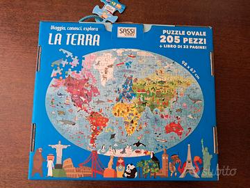 Splendido set educativo della linea Sassi Science, perfetto per piccoli esploratori! La confezione a valigetta con maniglia in corda contiene un puzzle ovale di grandi dimensioni e un libro illustrato per imparare tutto sul nostro pianeta. 🌍 Puzzle Ovale: 205 pezzi, dimensioni 98 x 67 cm. 📖 Libro incluso: 32 pagine piene di curiosità e illustrazioni. 🎨 Illustrazioni di: Matteo Gaule. ✅ Condizioni: Ottime, scatola integra e pezzi ben conservati. 💡 Ideale per: Imparare la geografia e la natura divertendosi.