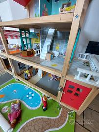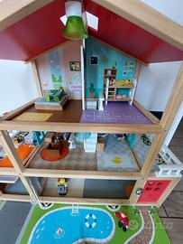 Vendo casa per bambole in legno Hape di tre piani completa di tutti gli arredi originali e di 11 personaggi in legno. In ottime condizioni. Danneggiata solo la tenda del sole ma riparabile.