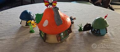 Villaggio puffi con casa grande e 2 case piccole, 12 puffi, girasole grande e una piantina verde.