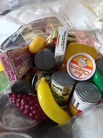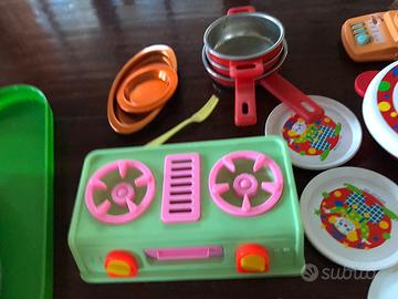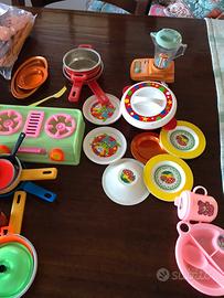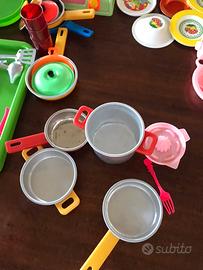 Set cucina per bambini con diversi servizi di piatti e posate, varie pentole, 2 vassoi, bicchieri, fornelli, frullatore e pietanze/confezioni e barattolame.