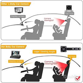 【Angolo regolabile e ampia gamma visibile】 -La telecamera sul sedile posteriore può regolare facilmente gli angoli su e giù in base al modello della tua auto e alle dimensioni del seggiolino di sicurezza, e l'angolo di visione della telecamera è di 150 °, che ti consente di vedere tanto contenuto del bambino possibile.