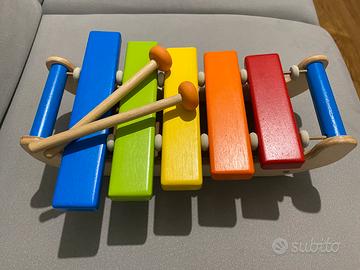 Un coloratissimo xilofono in legno per avvicinare i bambini alla musica. Cinque panneli colorati, ognuno riproduce un suono diverso quando viene colpito dalle due bacchette. Stimola la curiosità e lo sviluppo della coordinazione del bambino. Il gioco perfetto per avvicinare alla musica e, perché no, anche per un ripasso dei colori.