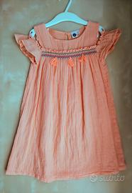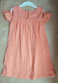 Vestito estivo in cotone con maniche elasticizzate a sbuffo. Color salmone, in stile etnico, con ricamo multicolore sul petto e nappine in tinta. Tessuto ad effetto stropicciato. Misura 4 anni. In perfette condizioni, tenuto con cura.
