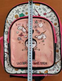 Zainetto bellissimo e molto particolare, nuovissimo mai usato come si vede dalle foto. Il tema è l'unicorno, il colore predominante è il rosa ma presenta brillantini sia nella parte anteriore che superiore Dotato di doppia tasca e apertura aterale per mettere la borraccia.per comodità fornisco misure ma sono disponibile per ulteriori info.