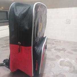 Con zip e tasca anteriore colore nero e rosso e disegno plastificato.