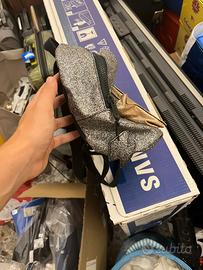 Zaino glitterato argentato in ottime condizioni, ideale per uso scolastico o tempo libero. Realizzato con materiale resistente e impreziosito da una finitura brillante che cattura la luce. Sul fronte sono presenti due applicazioni decorative: una stella dorata e un cuore rosa, che conferiscono un tocco distintivo. Compatto ma capiente, è dotato di chiusura a zip e spallacci regolabili.