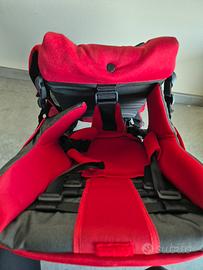 Zaino da montagna porta bambino, rosso e nero, marca Bebé Confort. Con tendina parasole e telo antipioggia. Multitasche. Uno spallaccio è leggermente scucito (foto 9) e nella parte posteriore uno dei ferri ha rovinato leggermente il rivestimento (foto 10). Per il resto è uno zaino usato al massimo una decina di volte, robusto, piuttosto leggero e tenuto molto