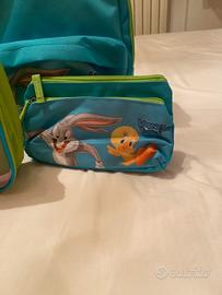 Bellissimo zaino NUOVO LOONEY TUNES completo di portamerenda termica e astuccio a 2 zip