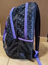 Zaino Mercoledì doppio scomparto con tasca frontale, tasca laterale in rete porta borraccia, tasca interna porta pc. Schienale preformato e personalizzato con fondo rigido, spallacci imbottiti e rivestiti in tessuto con sottospallaccio in rete.