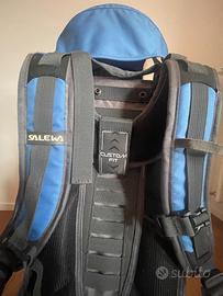 Zaino Portabambini marchio Salewa modello Koala II con copertura antipioggia e tettuccio parasole.
