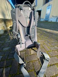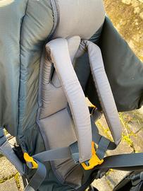 Zaino porta bimbi, con cuscino che avvolge la testa anche negli angoli e la sostiene per un comodo riposo. Peso distribuito per l'adulto. apertura laterale con cinture di sicurezza molto pratiche che consentono areazione per il bimbo. Incluso nella consegna: