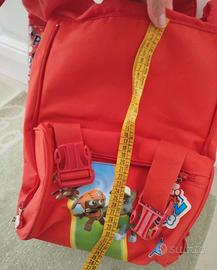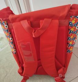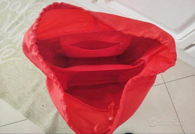 Zaino estensibile rosso in tela ed ecopelle nuovo senza etichetta. Diviso internamente in 2 scompartimenti. Sulla parte frontale frontale tascone con chiusura a zip, più tasche laterali. Spallacci imbottiti e regolabili. Dimensioni 35*34. Profondo chiuso 11 cm, aperto 15cm.