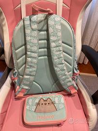 Zaino scuola nuovo con astuccio usato Pusheen con base e schiena rigido, 2 scomparti con zip grandi, 1 tascone frontale e 2 tasche piccole con zip laterali Misure: 41x33x20