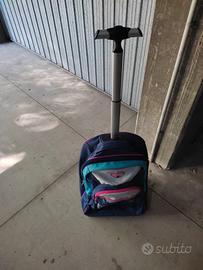 È pratico per via del suo manico telescopico e le rotelle che lo rendono un pratico trolley che aiuta a non caricare il peso dei libri su le spalle.
