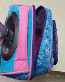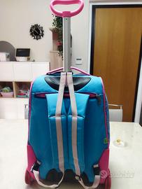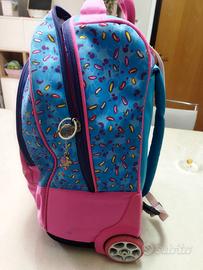 Vendo zaino scuola usato ma in ottime condizioni della Seven, serie SJ Girl. Il trolley è fisso e funzionante, le ruote non presentano problemi di bloccaggio. Le cerniere dei doppi scomparti si chiudono e non hanno difetti nelle maglie. I colori sono ancora vivi, presenta una leggera usura nella parte bassa del frontale. Lo zaino è molto spazioso e maneggevole per trasportare comodamente il materiale scolastico
