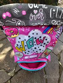 Zaino Seven in ottime condizioni: si può aumentare la dimensione con una comoda zip a lato, ha un separatore per dividere i libri, 2 tasche con zip, tutto funzionante e quasi nuovo. Ha la particolarità di poter scegliere tre diverse immagini sulla chiusura frontale, con calamite per fissare il disegno come fosse un libretto.