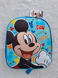 Misure zaino h 30 x 27 l x 10 p., con tema di Topolino e figure colorate, incluso nel prezzo il porta merenda, bottiglia con ciuccio e bicchiere per bambini, con tema Topolino e Pluto.
