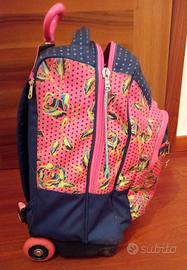 Zaino con trolley Seven colore rosa, viola. Lo zaino è in buone condizioni, il trolley funziona bene. Unico difetto è una cinghia di uno spallaccio un po' scucita nella parte bassa