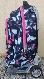 Zaino scuola usato con due tasche capienti, dotato di trolley ma con la possibilità di toglierlo e fare diventare lo zaino a spalla. Due ruote grandi e funzionanti.