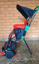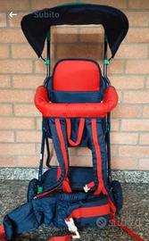 Lo zaino ha telaio in alluminio leggero, 2 ruote anteriori con copertura, capiente tasca porta oggetti, cintura girovita e spallacci regolabili, tettuccio parasole, pedanina poggiapiedi.