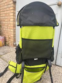 Zaino per portare i bambini da 6 mesi a 3 anni là dove il passeggino non può andare, spiaggia, sentieri sterrati, i ponti di Venezia. Spallacci imbottiti, capotina parasole e antipioggia, ampia sacca portaoggetti, portabiberon. Struttura in alluminio, sta in piedi da solo. Portata max 15 kg. Lo zaino è stato usato; è in buone condizioni generali MA è mancante del maniglione utile per sollevarlo e metterlo in spalla (si è strappato) e quindi l'operazione di "messa in spalla" è possibile con l'aiuto di un'altra persona, più difficile in totale autonomia.